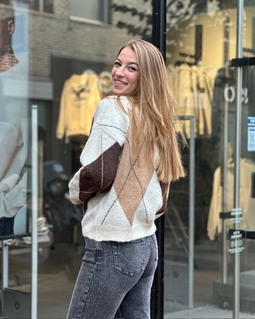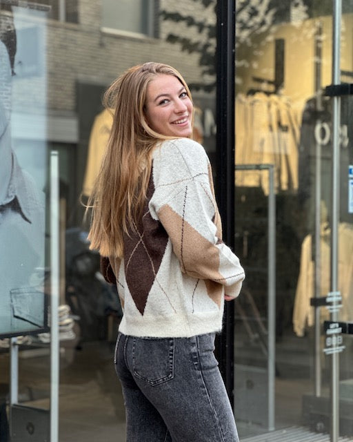 This delightful one-size-fits-all sweater combines comfort with a stylish retro look. It features a striking argyle pattern in warm earth tones—cream, beige, and brown—making it effortless to combine with any outfit. Made from a soft, knit fabric that feels lightweight yet cozy, ideal for transitional seasons or cold days.