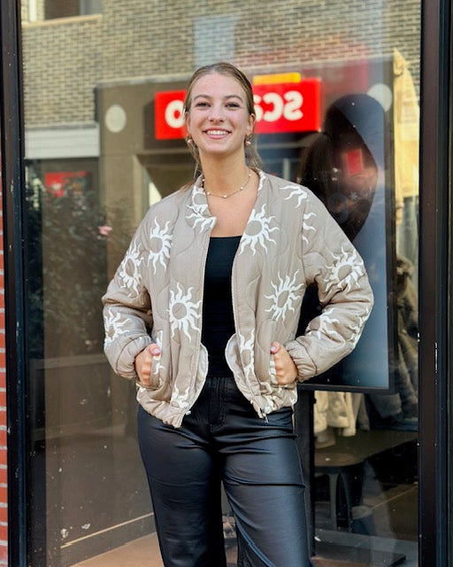 Gewatteerde One-Size Bomberjack. Taupe kleurige Jas met Beige Zon.